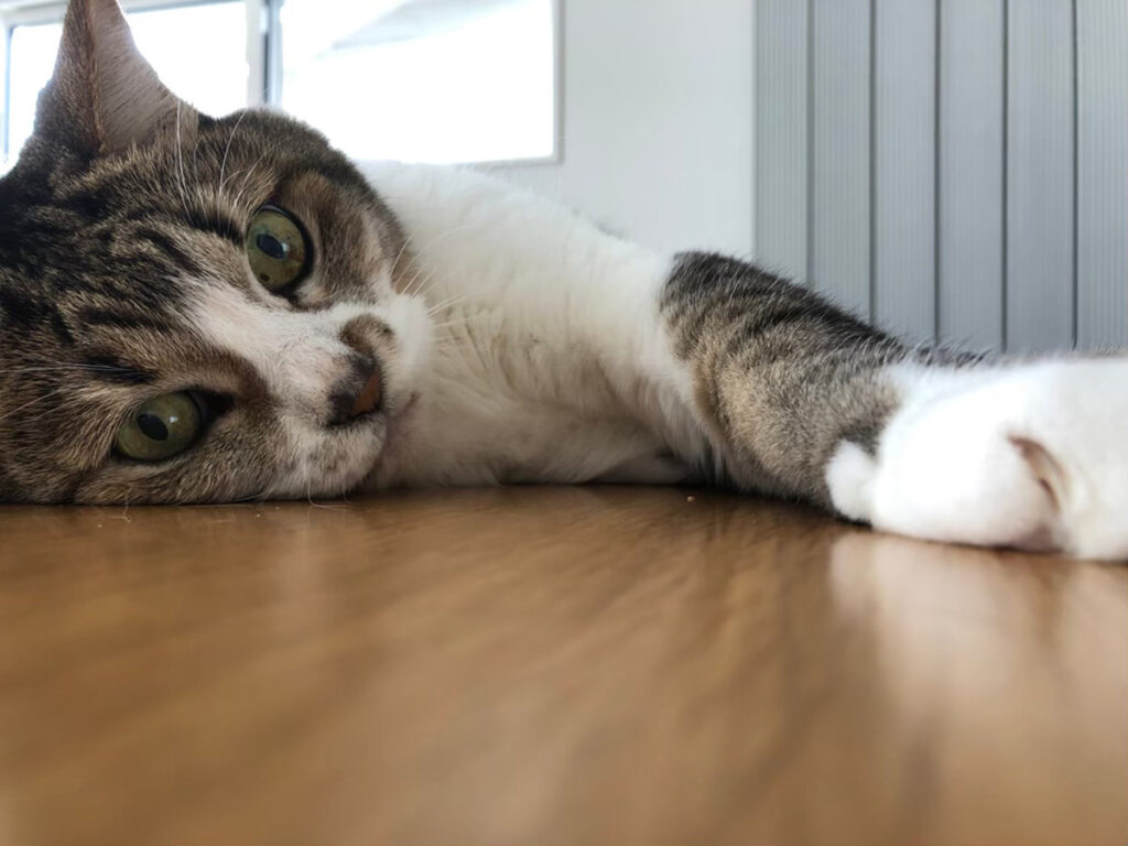 輻射式冷暖房を入れてから、家の中で部分的に暖かい場所・部分的に寒い場所がなくなりました。厳密には輻射式冷暖房パネル自体に近づくとじんわりと暖かいのですが、ストーブなどの強い暖かさはありません。家の中全体がほど良く暖かいので、寒い中暖かい場所を探す猫の姿は見なくなりました。寒さで体を丸くする様子もなく、寒いからよって来てスリスリすることもなくなりました。