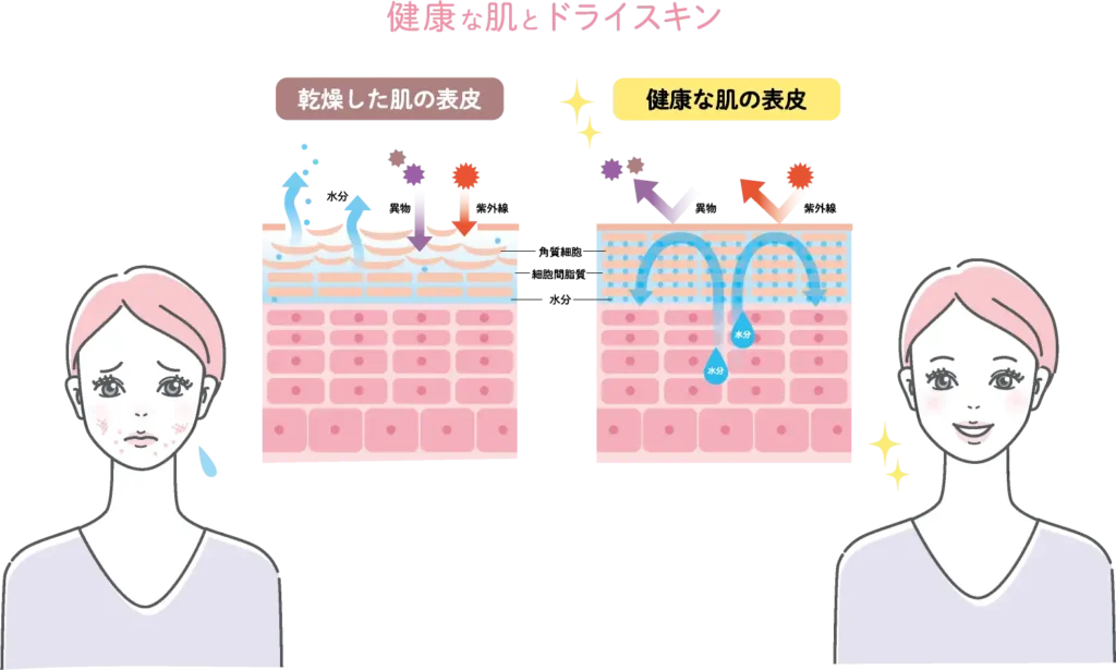 乾燥した室内で長時間過ごしていると、肌の最も外側にある表皮の角層から水分が奪われ、ごわつくとともに保湿機能やバリア機能が低下します。皮膚が乾燥すると、角質層の表面がはがれやすくなり、隙間ができてしまいます。この隙間から表皮の水分が蒸発し、水分を失った表皮はさらに薄く硬くなり、その結果がシワとなるといわれています。また、乾燥状態が続くことによって、肌のバリア機能が弱まり刺激を感じやすい状態になります。 その乾燥を放置してしまうと炎症を起こしやすくなり、炎症によってシミができやすくなるともいわれています。