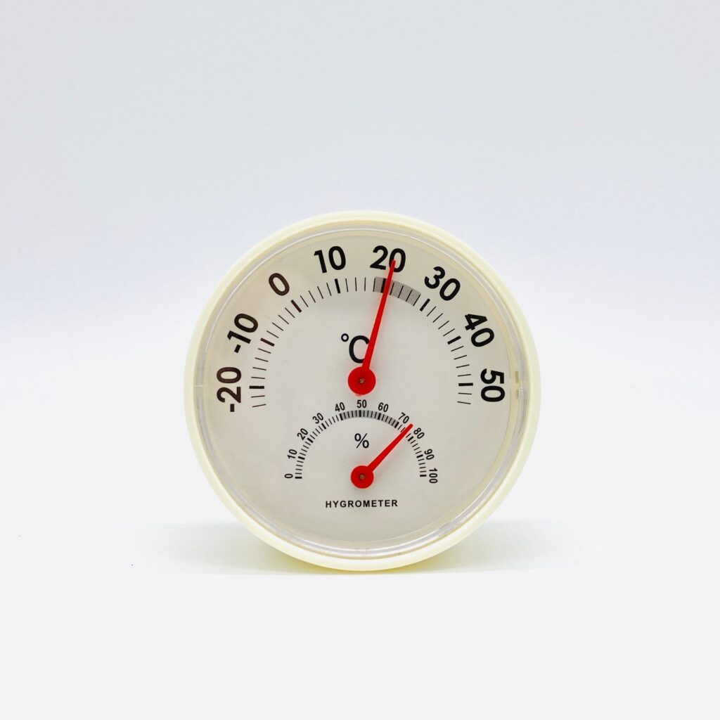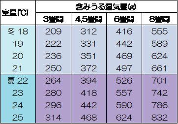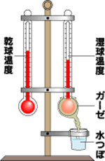 また逆に、湿球温度計が乾球温度計と同じ場合は、空気の中の水分が飽和状態になっていることを示します。このため、乾球温度と湿球温度の差が大きければ大きいほど相対湿度は低く、小さければ小さいほど相対湿度は高いと言うことになります。予め換算表を用意しておけば、温度差から室内の相対湿度を知ることが出来ます。