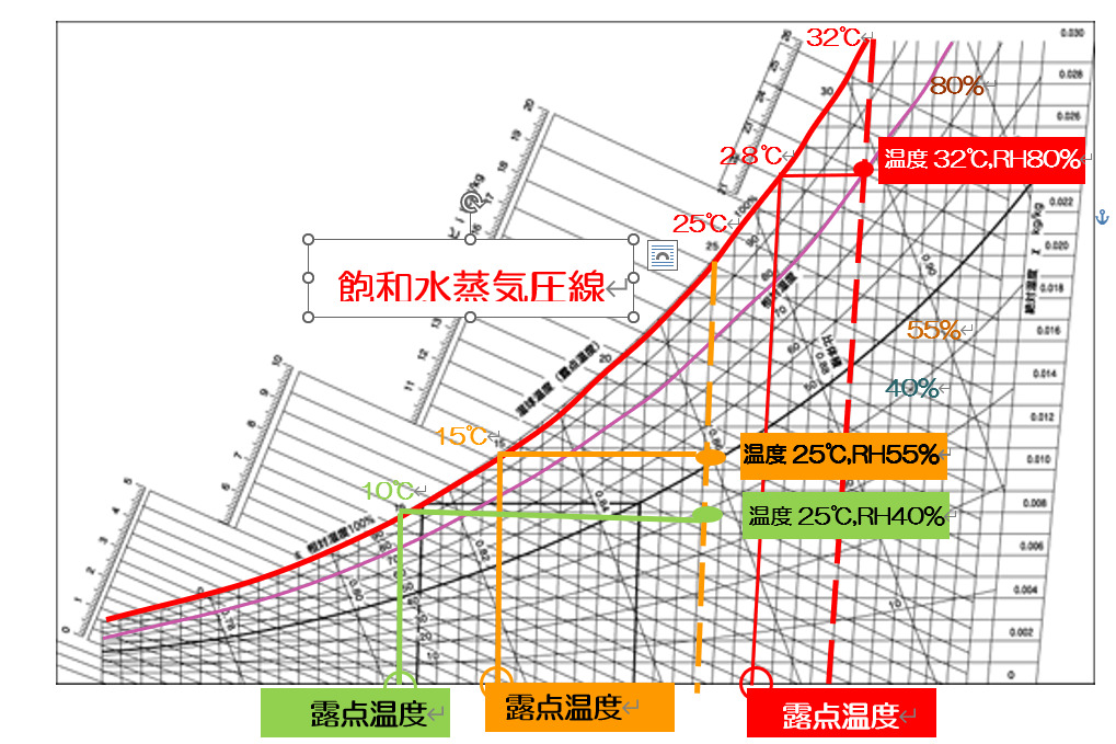 夏場の、外気(温度32℃)の場合、RHが28℃以下の部位に触れると液水が発生します(図2赤色ライン)。この場所が金属や塗装面であれば、表面に液水が残ります。