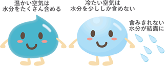 温度が高い暖かい空気は水蒸気を多く含んでいますが、冷たい空気は水蒸気を少ししか含むことができないので、暖かい空気が冷えると飽和水蒸気量も下がり、空気中に保持しきれなくなった水蒸気が水滴となって現れてくるのです。この飽和状態の時の気温、つまり水蒸気が水滴に変わる温度を「露点温度」と言います。