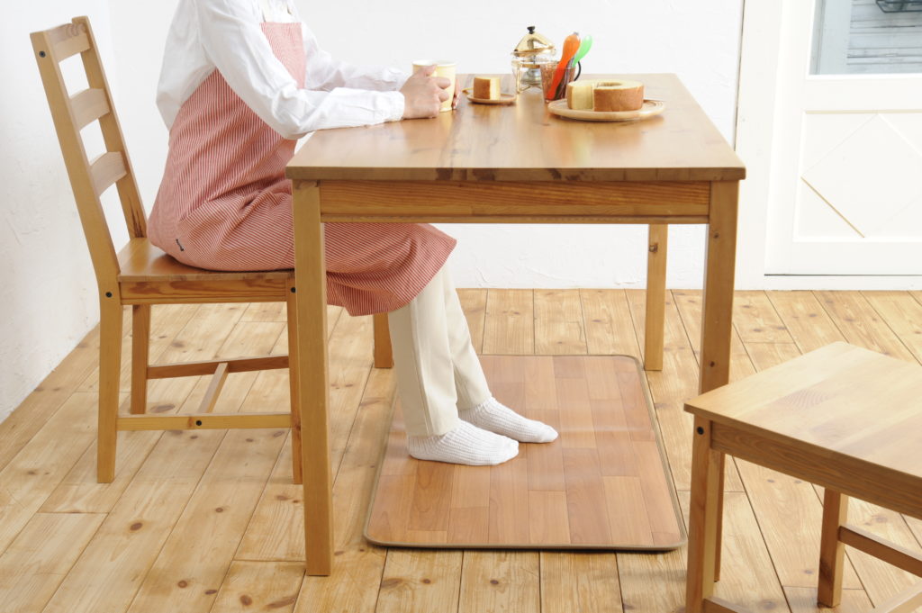 床暖房等との違いはいつでもどこにでも導入でき、使い勝手も良いです。スイッチひとつで使え、足元を暖めてくれます。人は熱源の多い上半身に比べて冷えやすい下半身は、寒さを感じ易く、この部分を局所的に暖めることで、高い暖房効果を得ることができます。