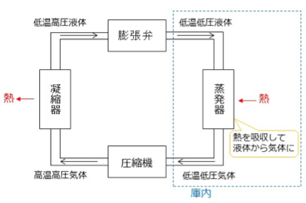 身近にある冷蔵庫で考えてみましょう。冷蔵庫内は、零度以下の冷凍室、5℃程度の冷蔵室等から構成されています。冷蔵庫が設置されるのかは室内であり、庫内と庫外では温度差があります。冷蔵庫は、この温度差を気化熱の原理を応用し熱移動を実現しています。 庫内の熱移動は、圧縮⇒凝縮⇒膨張⇒蒸発のサイクルで実現し、このサイクルを繰り返す事で、冷蔵庫の中を冷やしています。 このように、冷媒が圧縮機によって圧縮されます。理想気体の状態方程式により体積が小さくなると、圧力と温度が上昇します。