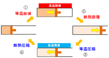 初期状態はピストンの中に空気が入っており、①ここに高温の熱源を近づけると熱が伝わりピストン内の空気が膨張します。これを等温膨張と言います。外部との熱のやり取りがない状態で、②内部空気が膨張すると、熱力学の法則から温度は低下します。これを、断熱膨張と言います。次に、③低温熱源を利用し等温変化でピストン内の空気から熱を奪います。等温膨張とは逆の動きです。これを、等温圧縮と言います。この時、内部の圧力は下がり体積は小さくなります。熱のやりとりがない状態で、④気体が圧縮され初期状態にもどります。これを断熱圧縮と言います。カルノーサイクルは、高温熱源と低温熱源を利用して言います。一連のサイクルを完結させます。このサイクルが、図1の冷蔵庫の冷凍サイクルと同じだと言う事に気づかれると思います。