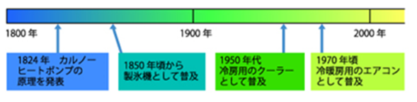 カルノーサイクルを応用したヒートポンプは、冷却用としての開発が進み1850年頃氷を製造する製氷機として普及がはじまりました。