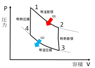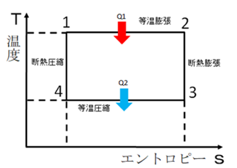 それぞれの状態に1~4の番号がついています。赤い矢印が受熱、青い矢印が放熱を表しています。 カルノーサイクルでは、1⇒2⇒2⇒3⇒4と状態に遷移します。1⇒2:等温膨張、2⇒3:断熱膨張、3⇒4:等温圧縮、4⇒1:断熱圧縮の動作となります。