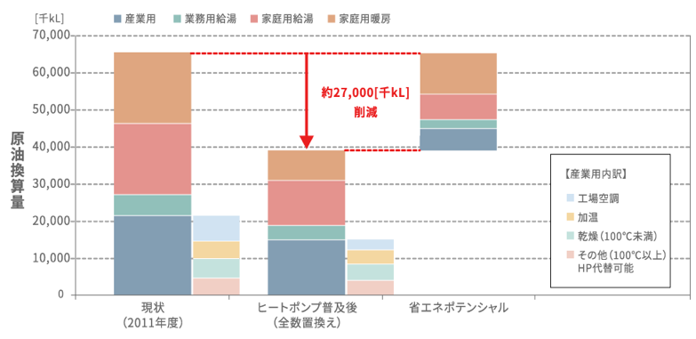 ヒートポンプは、熱を集めて移動させる技術であり、電力は熱を運ぶ動力として使うため、少しの電力で大きな熱を利用することができます。ガスや石油等の燃焼方式に比べると、CO排出量の大幅削減が実現できる技術として注目されています。​​ 家庭用の暖房・給湯、業務用の空調・給湯、産業用の空調・加温・100℃未満の乾燥でそれぞれの需要において燃焼式の熱源をすべてヒートポンプ式に転換した場合、約1.3億トンの削減が可能との試算があります。これは、日本のCOの約10%削減に相当します。