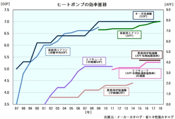 省エネ家電を選ぶときは、COP値がなるべく高い商品を選ぶのがお勧めです。また、消費者が効率の改善による性能向上を求めたことが、メーカーの開発インセンティブとなり、急激な高効率化が達成されたと言われております。これからも私達消費者から情報発信が必要になって行くかと思います。