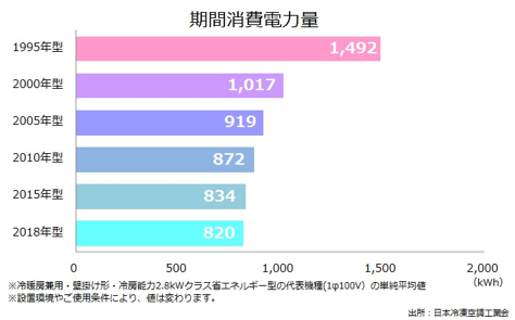 図4の通り、約20年前のエアコンとくらべると、毎年消費電力量は減少し2018年度で半分近く(55%)になっています。​​ これは、住宅の断熱性能が向上し、冷房効率が向上した事も加味したとしても、大きな削減効果であります。国の推進するZEH※5住宅の普及の後押しに一役貢献していますね。