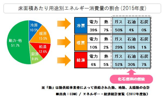「業務部門」のエネルギー利用の内、給湯や冷暖房といった「熱」利用が約半分を占めています。実際は、給湯や暖房需要のほとんどが、化石燃料を直接燃焼して使用されています。​​ 給湯や暖房に業務用エコキュート※6などのヒートポンプ機器を導入すれば、COの削減が期待できると考えられています。