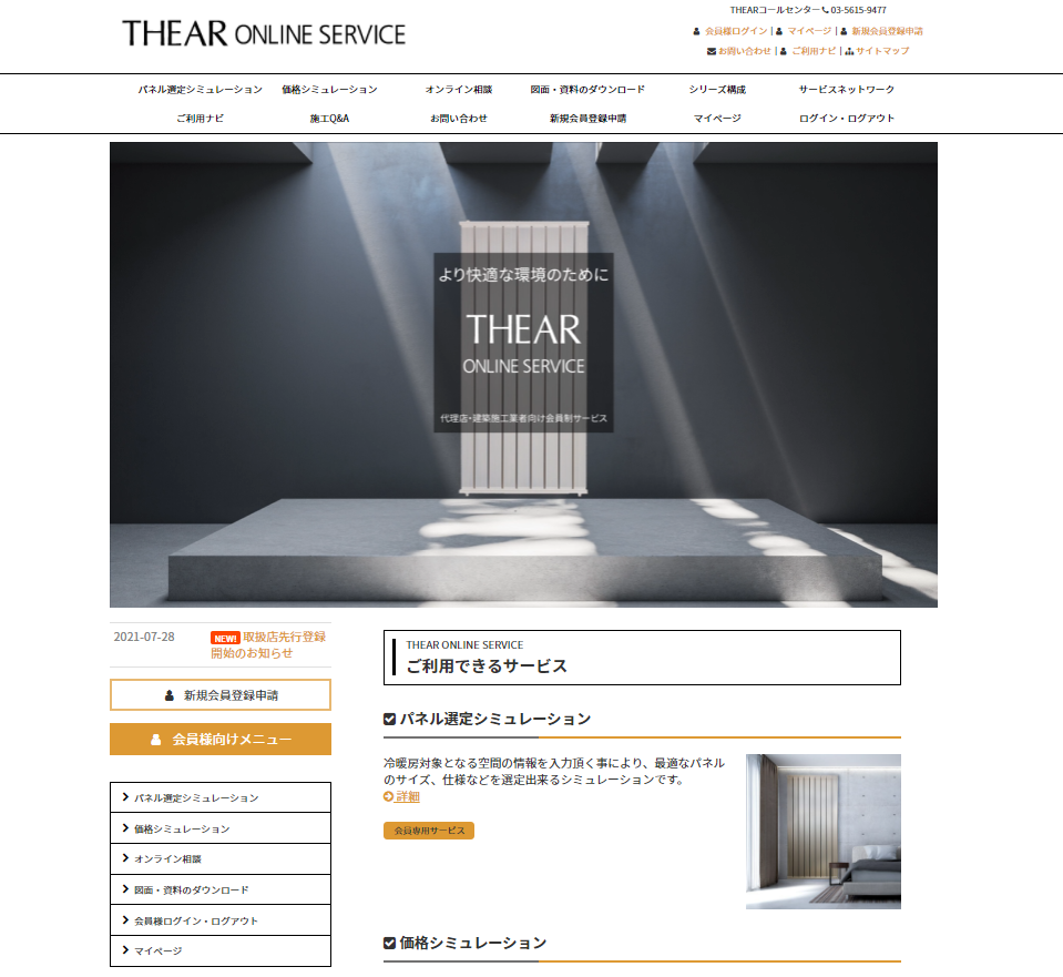 シアーオンラインサービスとは弊社の会員様向けサービスです。前記の「パネル選定シミュレーター」をはじめ「自動見積りシミュレーター」や、設計事務に必要な「CADデータのダウンロード」などを、オンライン上で好きな場所で好きな時に作業できる便利なサービスとなっています。