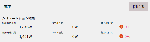 ここでは、前項で算出された建物の熱負荷に対して、どれくらい冷暖房能力が必要かを算出するシミュレーションをします。繰り返し申し上げているように、冷暖房能力の充足度の測り方は、輻射パネルの出力(W) > 室内の熱負荷(W)ですので、指定するサイズのパネルの能力を足し算して、熱負荷から割り算すれば、該当する輻射パネルの冷暖房能力の充足率が何パーセントになっているかを数値化することができます。