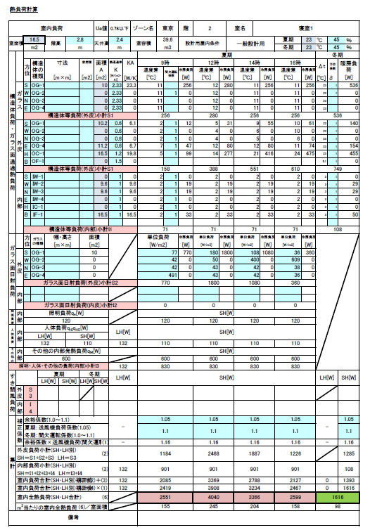 当社も以前は、設備設計事務所様がよく使う、下記のようなエクセルの「熱負荷計算シート」を使用していましたが、輻射パネルのシミュレーションには不要な情報や入力項目が多く、最近は改変したサマリーの計算シートを使用していました。ご存知のとおり下記シートはあくまでも1室内の熱負荷計算ですので5部屋あれば、この計算を5回行わなければならず、なかなか大変でした。