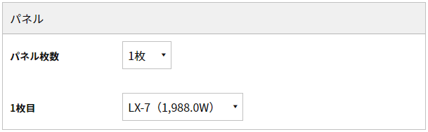 先ほどのシミュレーション画面の最下部のところに、以下のようにパネルをプルダウン選択できるメニューがあります。各パネルが表示されている右側の括弧内に、パネルの定格出力が記載されていますので、こちらから希望のパネルを選択して充足率を確認するという流れになります。