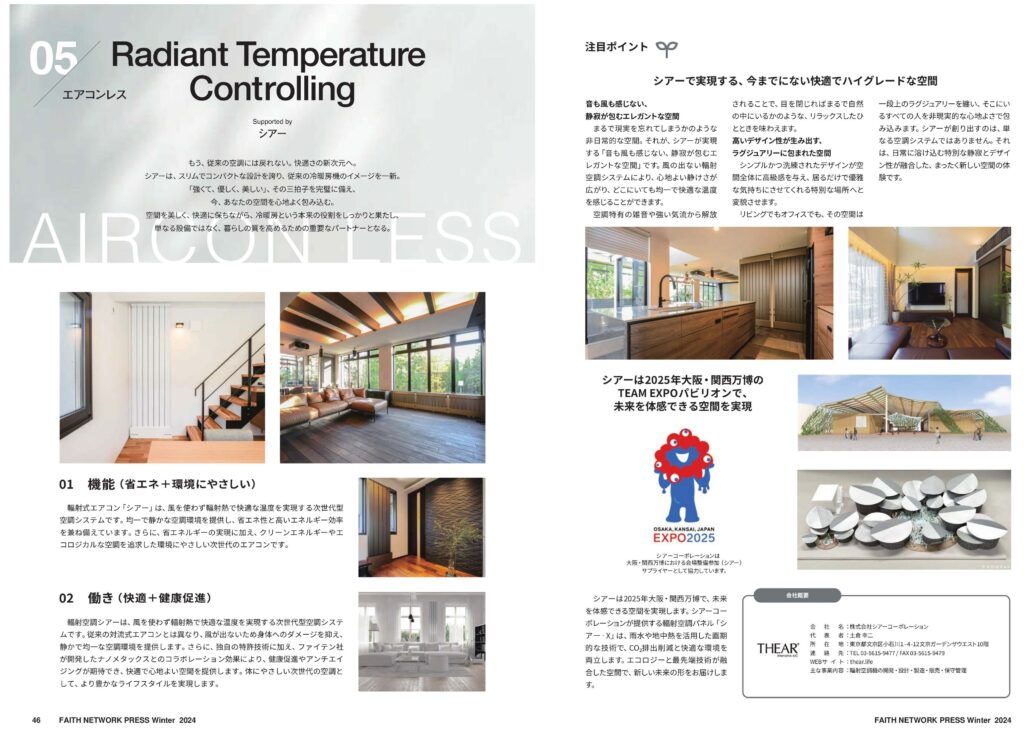 フェイスネットワーク様は、都市型不動産の企画・開発を手掛ける企業であり、高品質な賃貸住宅やオフィス空間の提供を行っています。今回の掲載では、THEARが持つ静寂性、快適性、省エネ性などの特徴が評価され、高級賃貸物件への導入事例とともに紹介されました。
